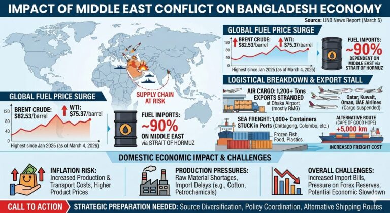 নিজস্ব প্রতিবেদক, ঢাকা: ইরান, ইসরায়েল এবং মার্কিন যুক্তরাষ্ট্রকে কেন্দ্র করে মধ্যপ্রাচ্যে ক্রমবর্ধমান সামরিক উত্তেজনা বাংলাদেশের অর্থনীতিতে বড় ধরনের ধাক্কা দিয়েছে। এই সংকটের …