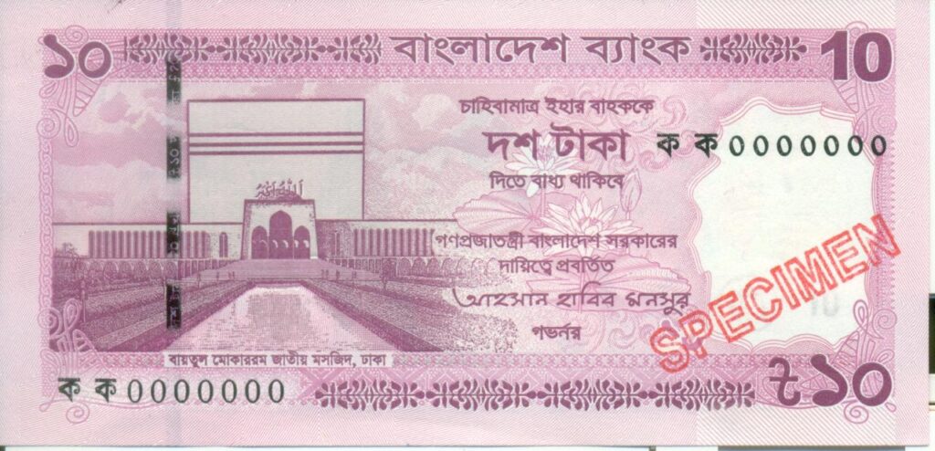 - সি-থ্রু ইমেজ: আলোর বিপরীতে ধরলে নোটের ওপরের নির্দিষ্ট প্যাটার্নে ‘১০’ লেখাটি দৃশ্যমান হবে ।