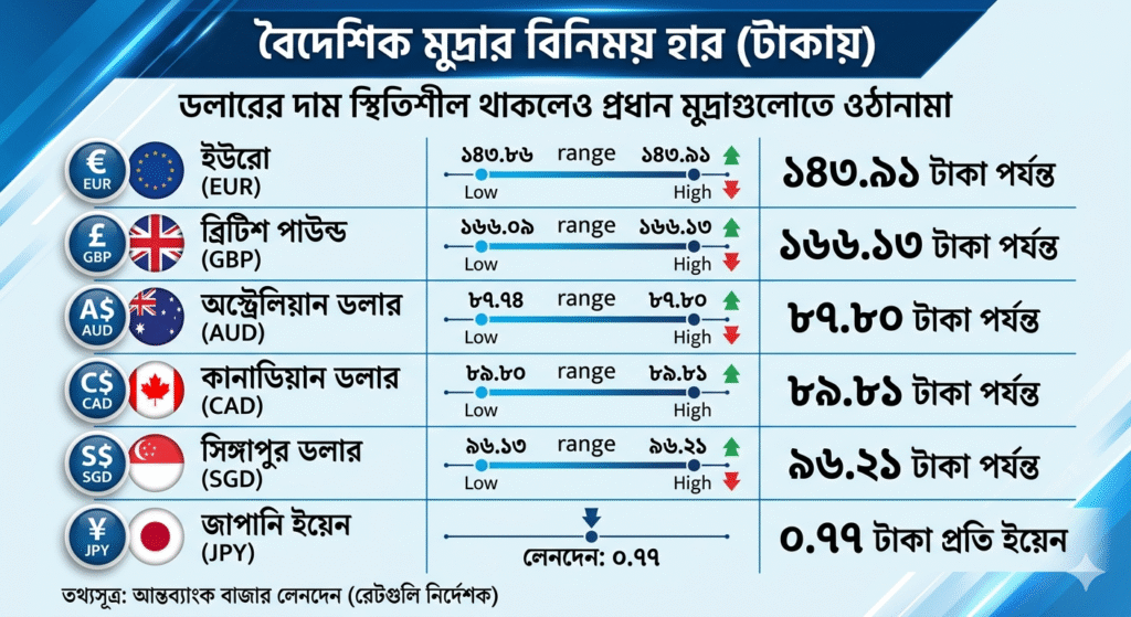 - কানাডিয়ান ডলার: ৮৯.৮০ থেকে ৮৯.৮১ টাকার মধ্যে অবস্থান করছে।