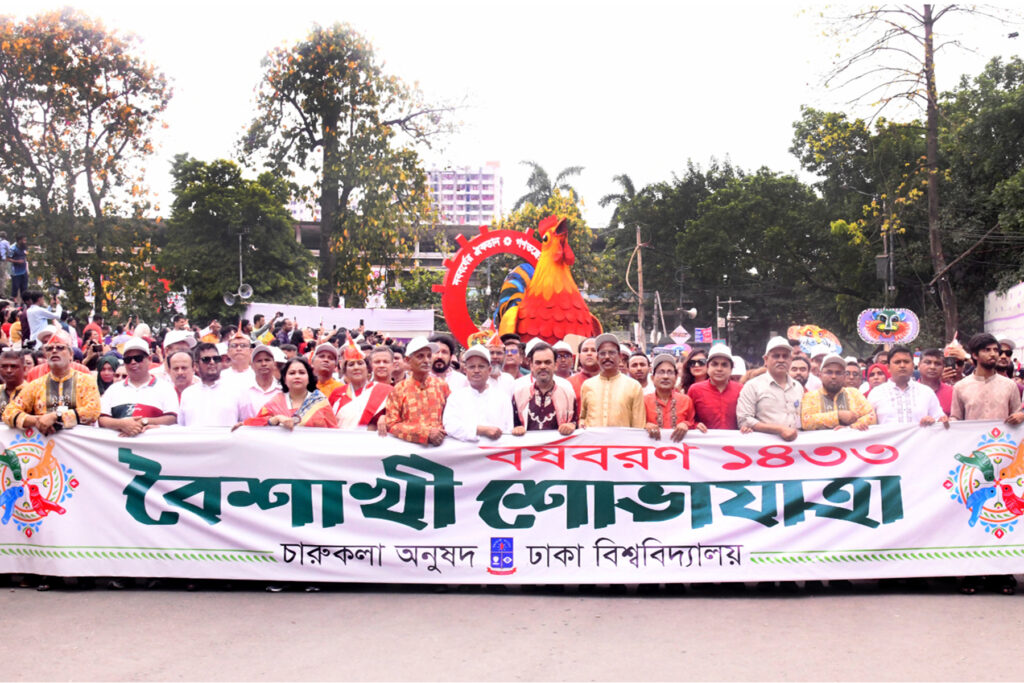 নিজস্ব প্রতিবেদক, ঢাকা: ‘নববর্ষের ঐকতান, গণতন্ত্রের পুনরুত্থান’—এই প্রতিপাদ্য সামনে রেখে বর্ণাঢ্য আয়োজনের মধ্য দিয়ে আজ মঙ্গলবার (১৪ এপ্রিল) ঢাকা বিশ্ববিদ্যালয়ে বাংলা নববর্ষ-১৪৩৩ উদযাপিত হয়েছে। উৎসবের প্রধান আকর্ষণ হিসেবে সকালে চারুকলা অনুষদ থেকে বের করা হয় ঐতিহ্যবাহী ‘বৈশাখী শোভাযাত্রা’।