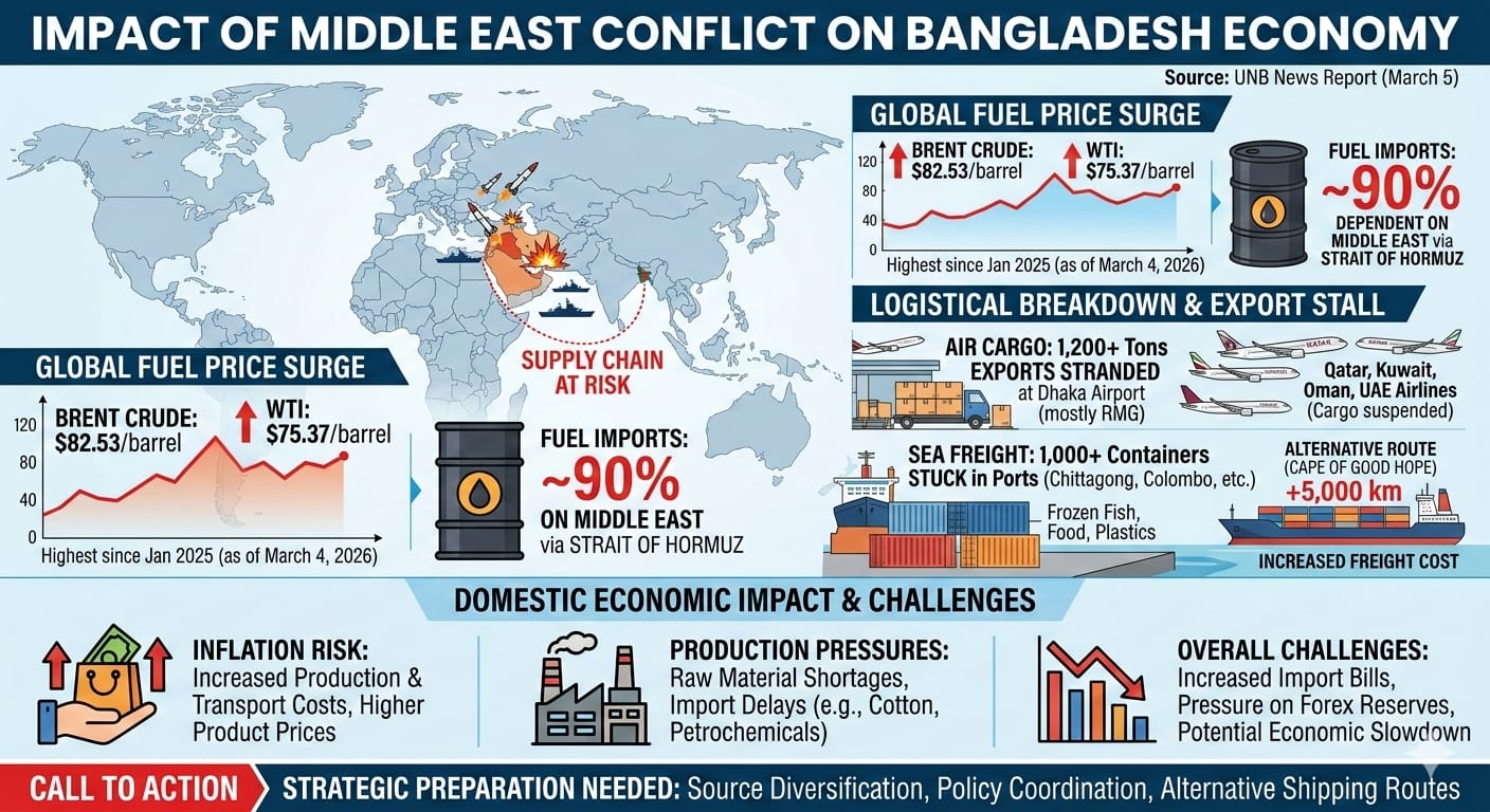 নিজস্ব প্রতিবেদক, ঢাকা: ইরান, ইসরায়েল এবং মার্কিন যুক্তরাষ্ট্রকে কেন্দ্র করে মধ্যপ্রাচ্যে ক্রমবর্ধমান সামরিক উত্তেজনা বাংলাদেশের অর্থনীতিতে বড় ধরনের ধাক্কা দিয়েছে। এই সংকটের ফলে জ্বালানি তেলের দাম বৃদ্ধির পাশাপাশি হাজার হাজার টন রপ্তানি পণ্য আটকা পড়ে চরম অনিশ্চয়তা তৈরি হয়েছে।